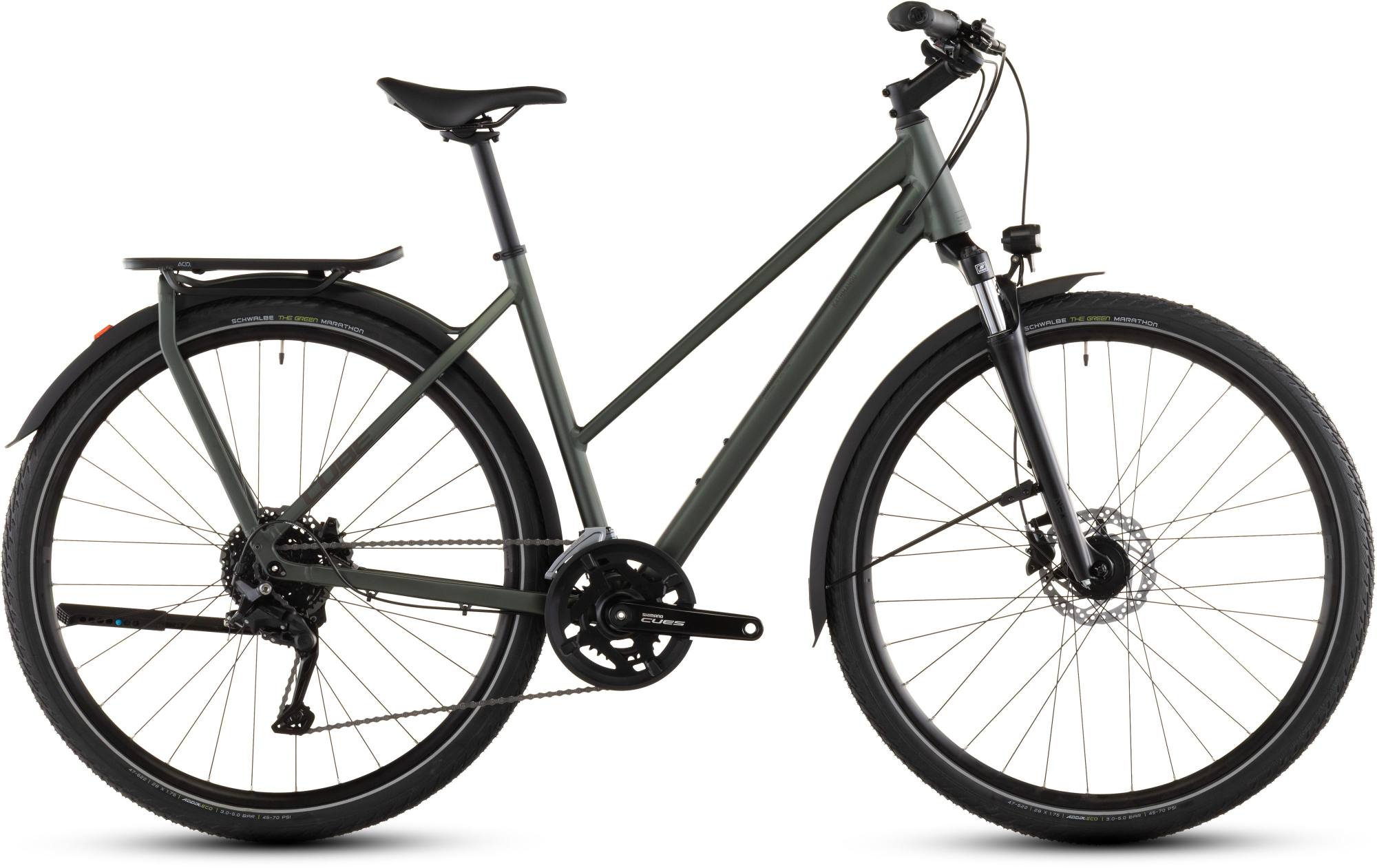 Fiets waarheen je wilt. De ingetogen eenvoud van de Kathmandu ONE doet niets af aan zijn robuustheid en aanpassingsvermogen. Kijk wat beter en je ziet de stevige IC 3.0-bagagedrager ? het ideale platform om alles mee te nemen wat je nodig hebt. Lange spatborden, voor- en achterlichten en een standaard, ze zijn allemaal inbegrepen. Met Shimano?s degelijke 2x9 Cues-versnellingen heb je altijd een passend verzet paraat, terwijl de krachtige hydraulische schijfremmen van Shimano zorgen dat je veilig kunt vertragen, ongeacht het weer. Een verende voorvork van Suntour strijkt ruwe wegen glad. De Schwalbe Green Marathon-banden zijn gemaakt van gerecycled rubber om de impact op het milieu te verminderen. Waar speelt jouw volgende avontuur zich af?